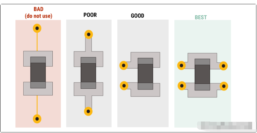 当使用过孔到达电源层时,将电容器连接到组件引脚,然后连接到过孔以确保电流流过电源层。